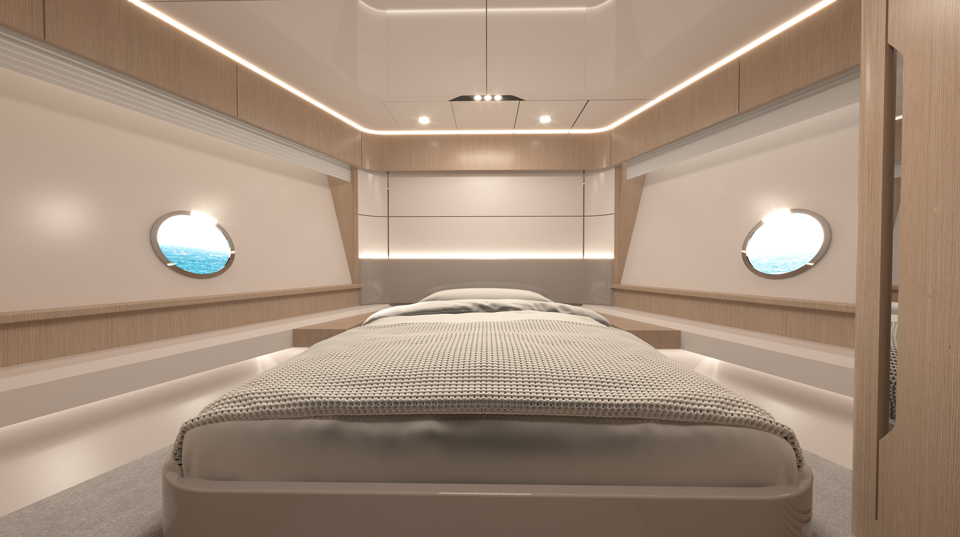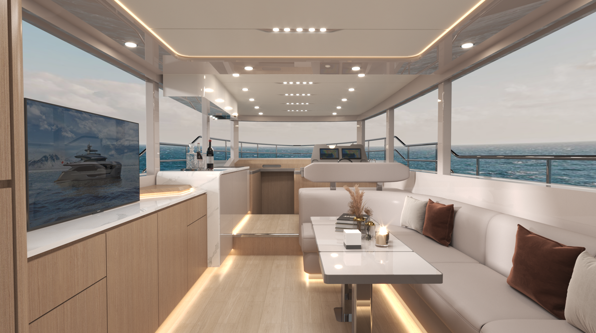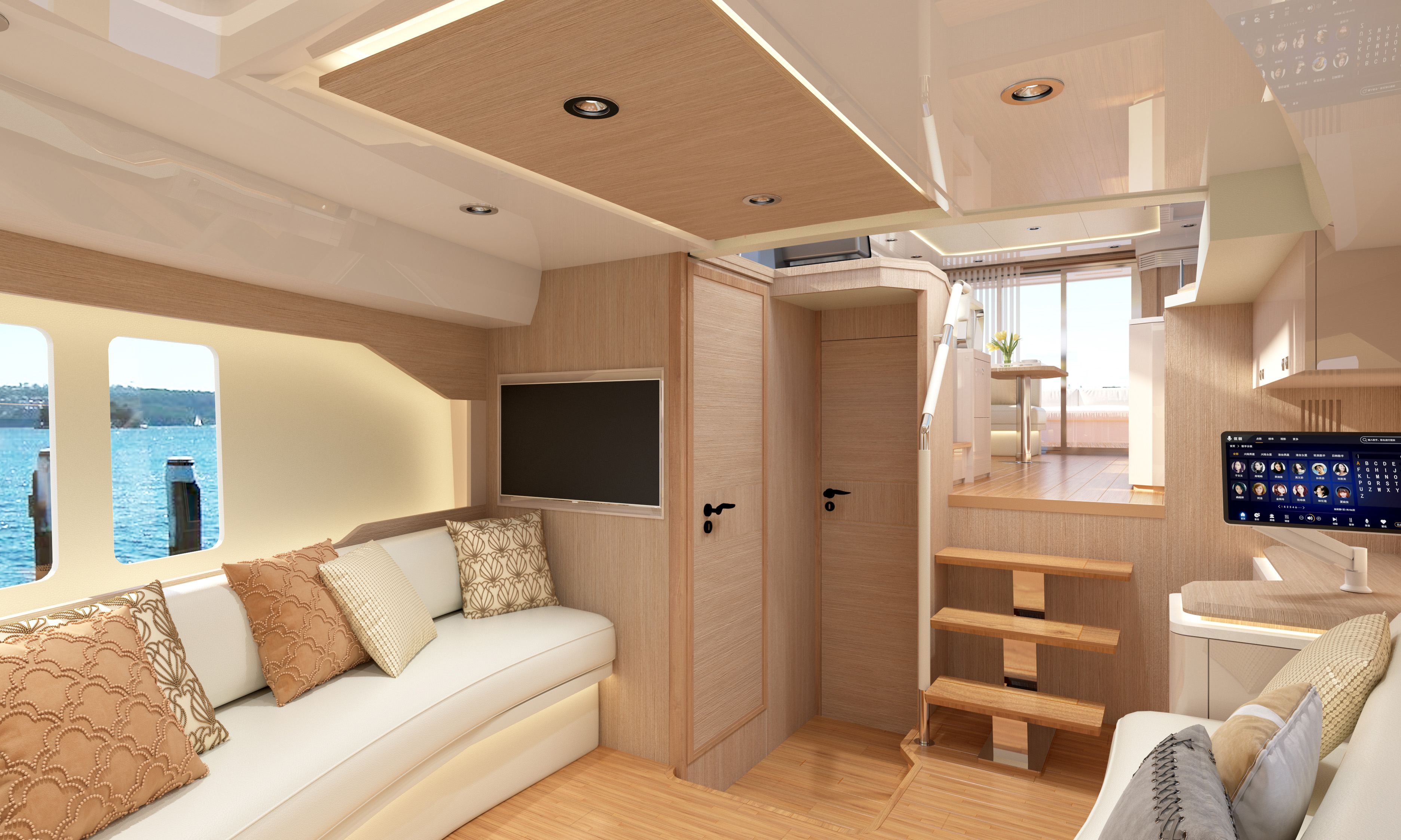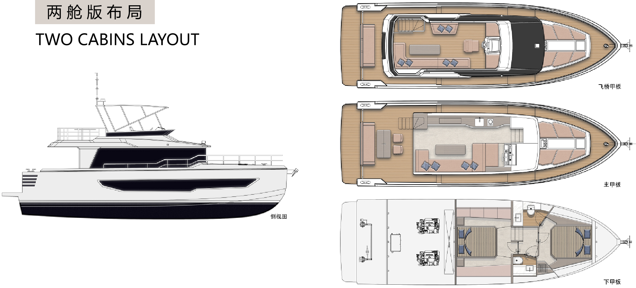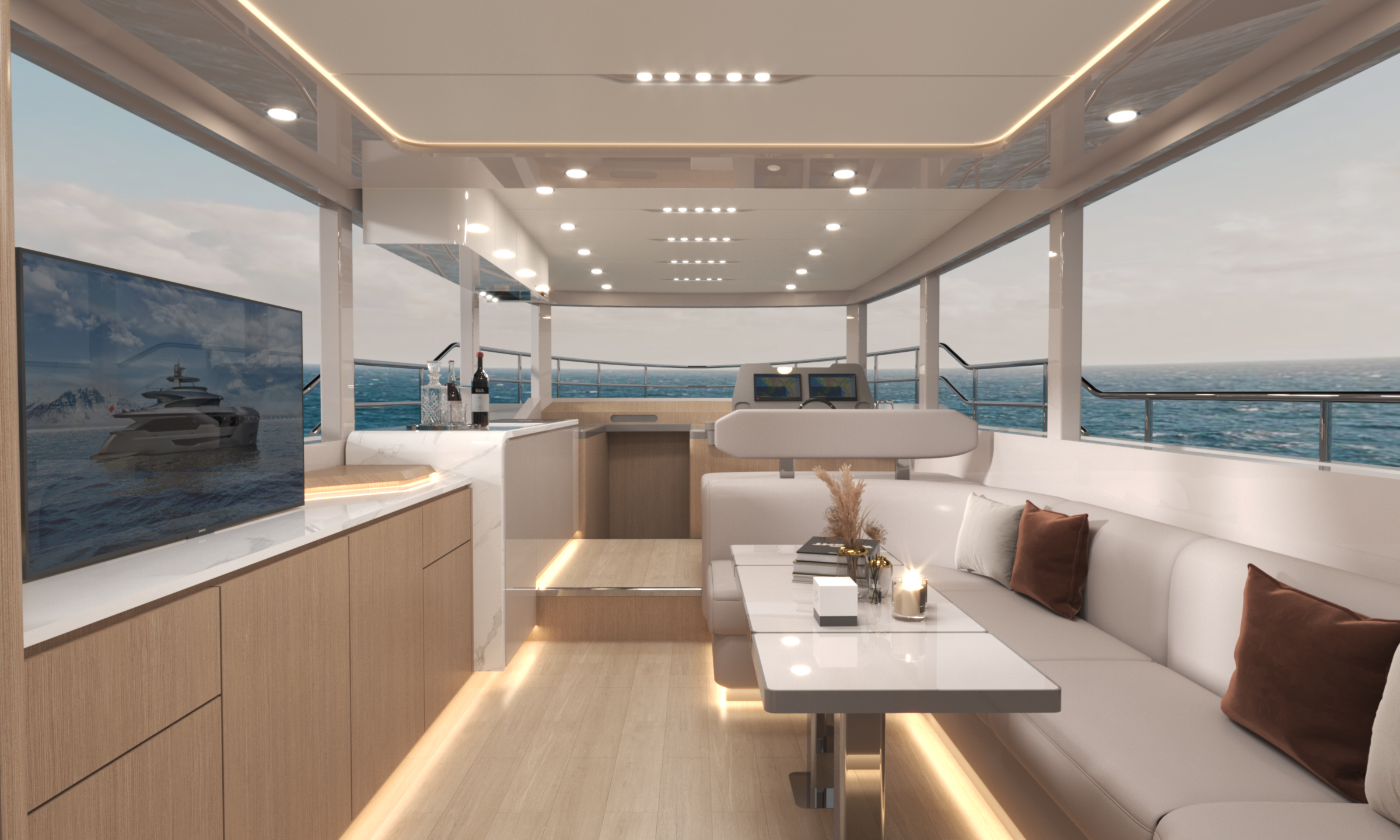 簡(jiǎn)約休閑沙龍功能區(qū),開(kāi)放式甲板空間,滿足不同的水上生活方式。主甲板布局集沙發(fā)、餐桌、娛樂(lè)系統(tǒng)、開(kāi)放式廚房以及體驗(yàn)感十足的駕駛區(qū)為一體,是一個(gè)集休閑和新生活方式的商務(wù)交流平臺(tái)。體驗(yàn)一次烹飪,來(lái)一場(chǎng)樂(lè)趣party,觥籌交錯(cuò),肆意灑脫,與親朋好友,縱情海天之間,體驗(yàn)無(wú)拘歡樂(lè)。