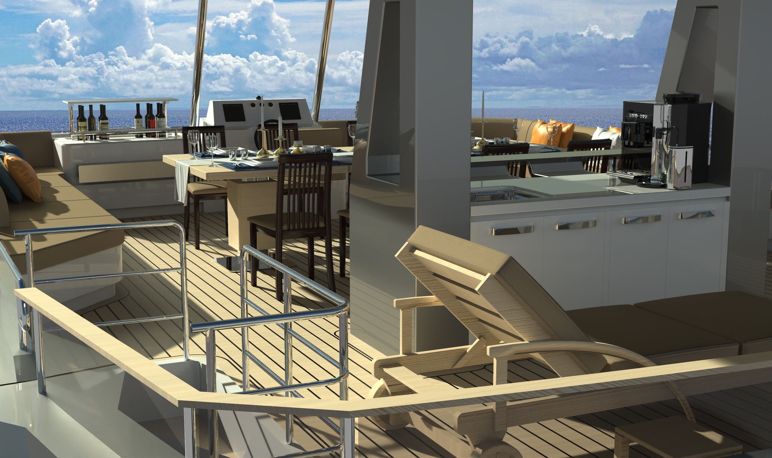 主甲板沙發(fā)后側(cè)帶有開放式的廚房