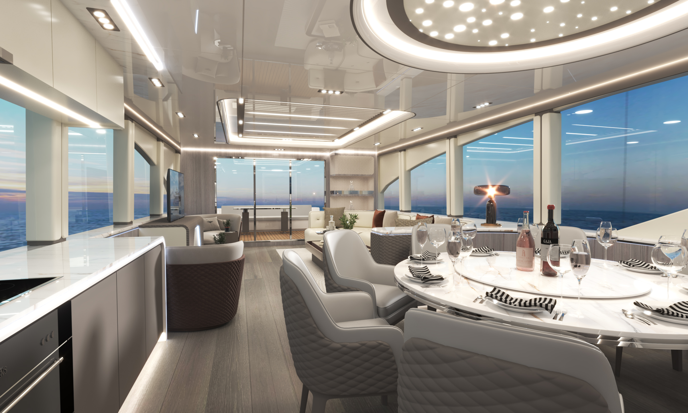 定制化的豪華商務(wù)沙龍廳,奢華與舒適的氛圍彌漫每一寸空間。細(xì)膩的皮革沙發(fā)、精致的木質(zhì)裝飾板以及柔和的燈光相互映襯,營造出溫馨而高雅的環(huán)境。巨大的窗戶將窗外的海景盡收眼底,藍(lán)色的海洋一望無際,海浪輕輕拍打著游艇,讓人在商務(wù)交流之余,也能盡情享受大自然的美妙。
