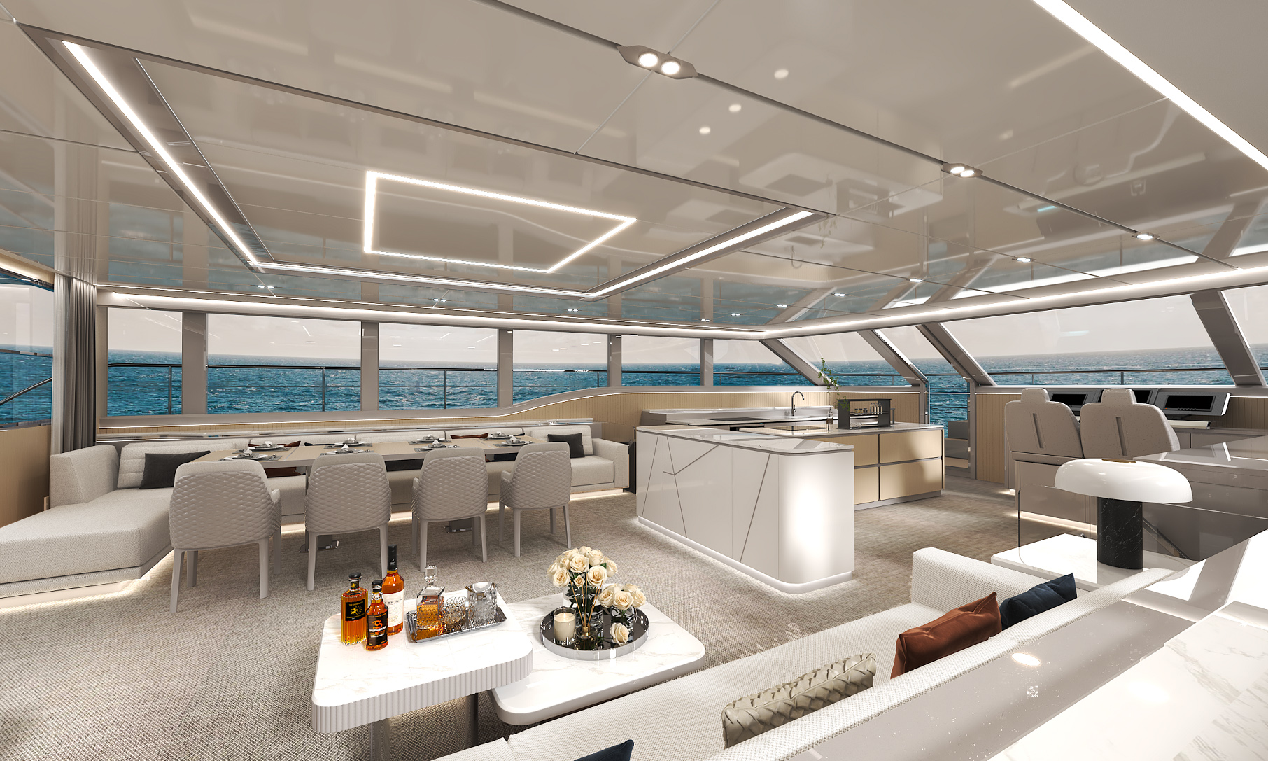 商務(wù)沙龍區(qū)堪稱海上多功能空間典范,超大視野窗戶打破空間界限,將海天盛景引入室內(nèi)。這里集餐飲、娛樂、休閑功能于一體,無論是商務(wù)洽談還是親友聚會(huì),都能在奢華舒適的氛圍中完美進(jìn)行。